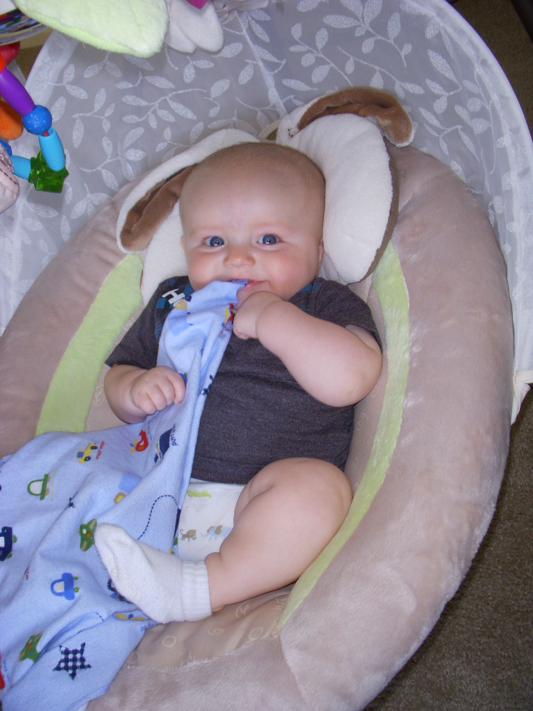 Loves putting anything and everything into his mouth! I took this picture cause he looked like a little puppy chewing on his blanket, the next time I walked by he had ripped his sock off and it was dangling from his mouth. Love this little boy!